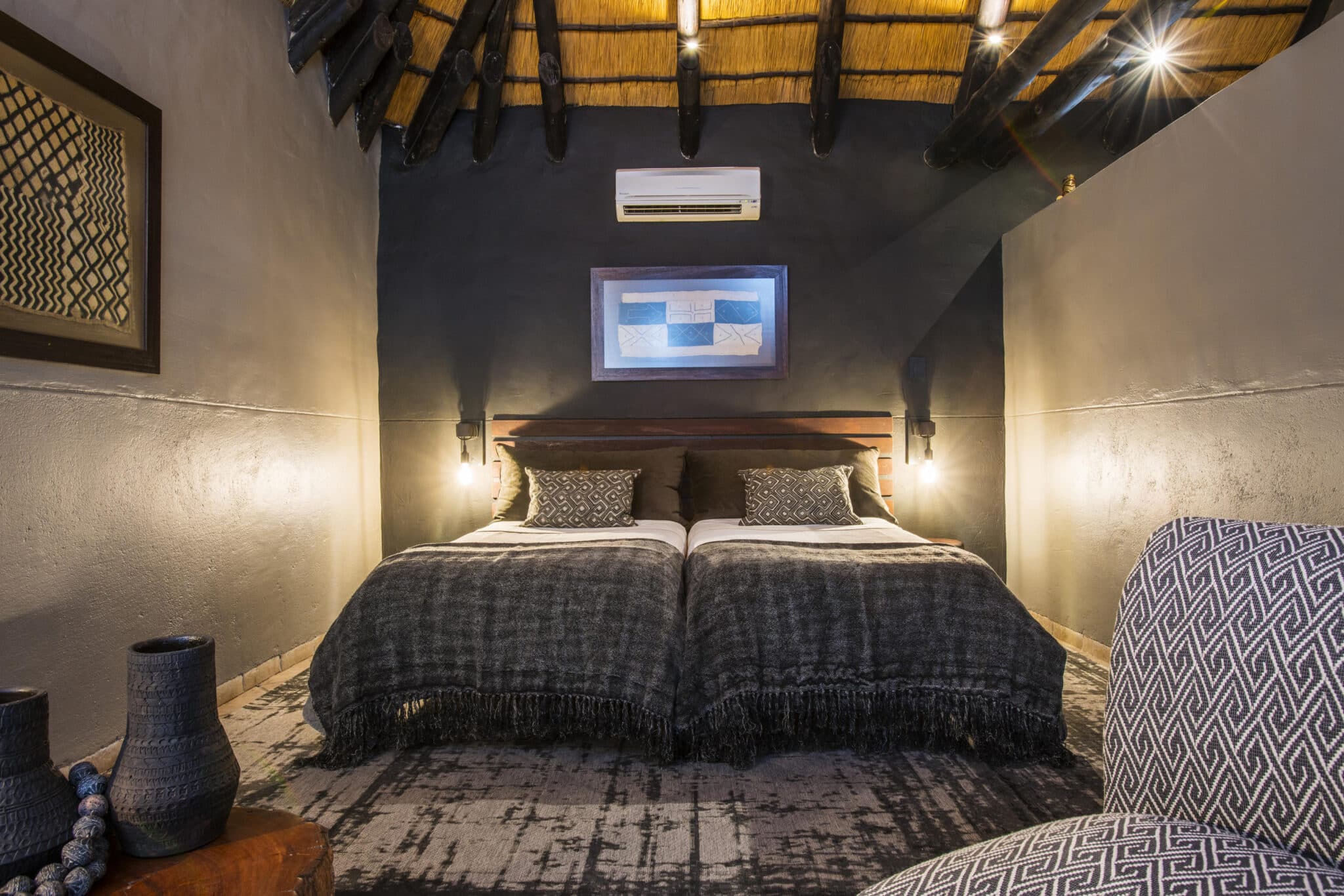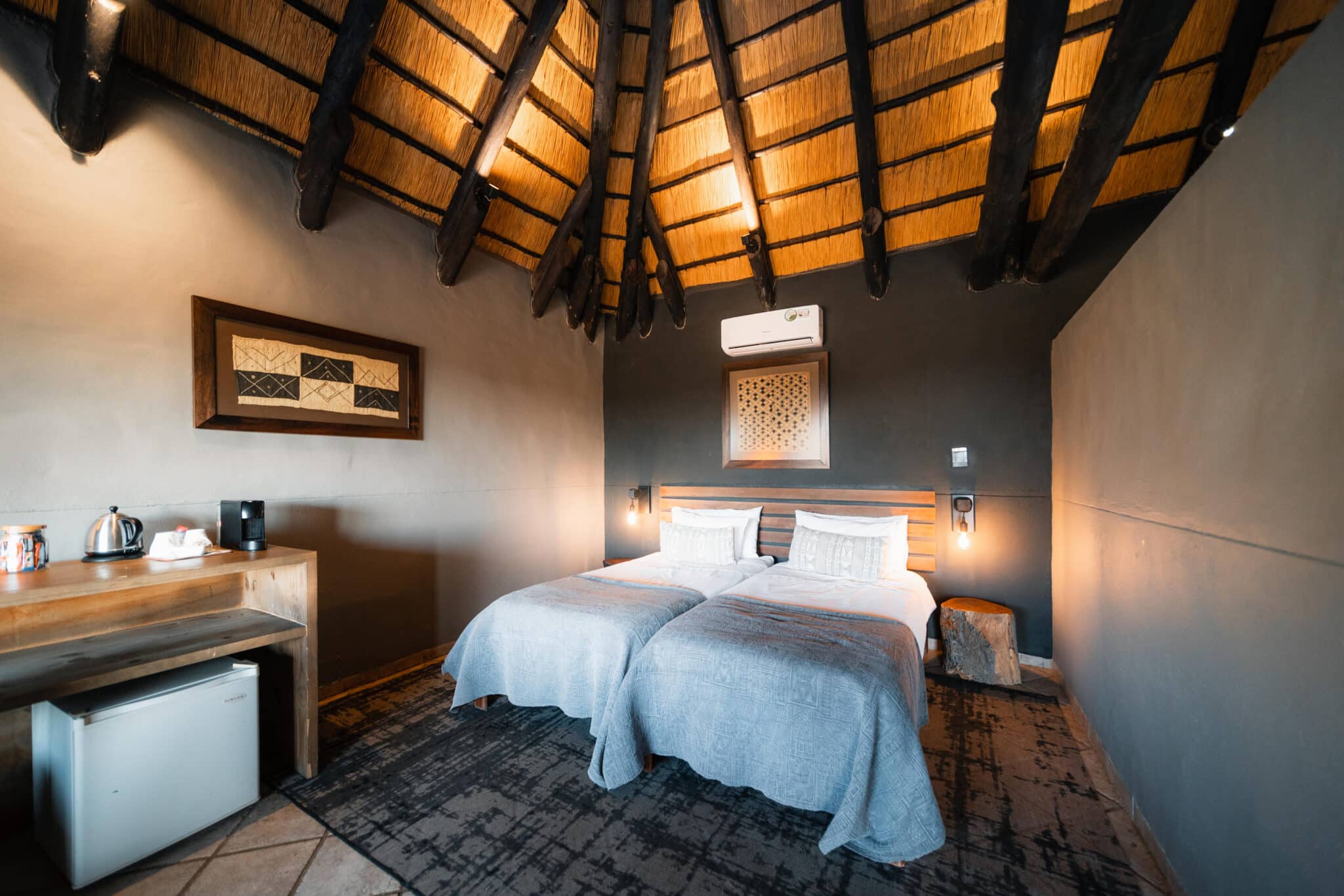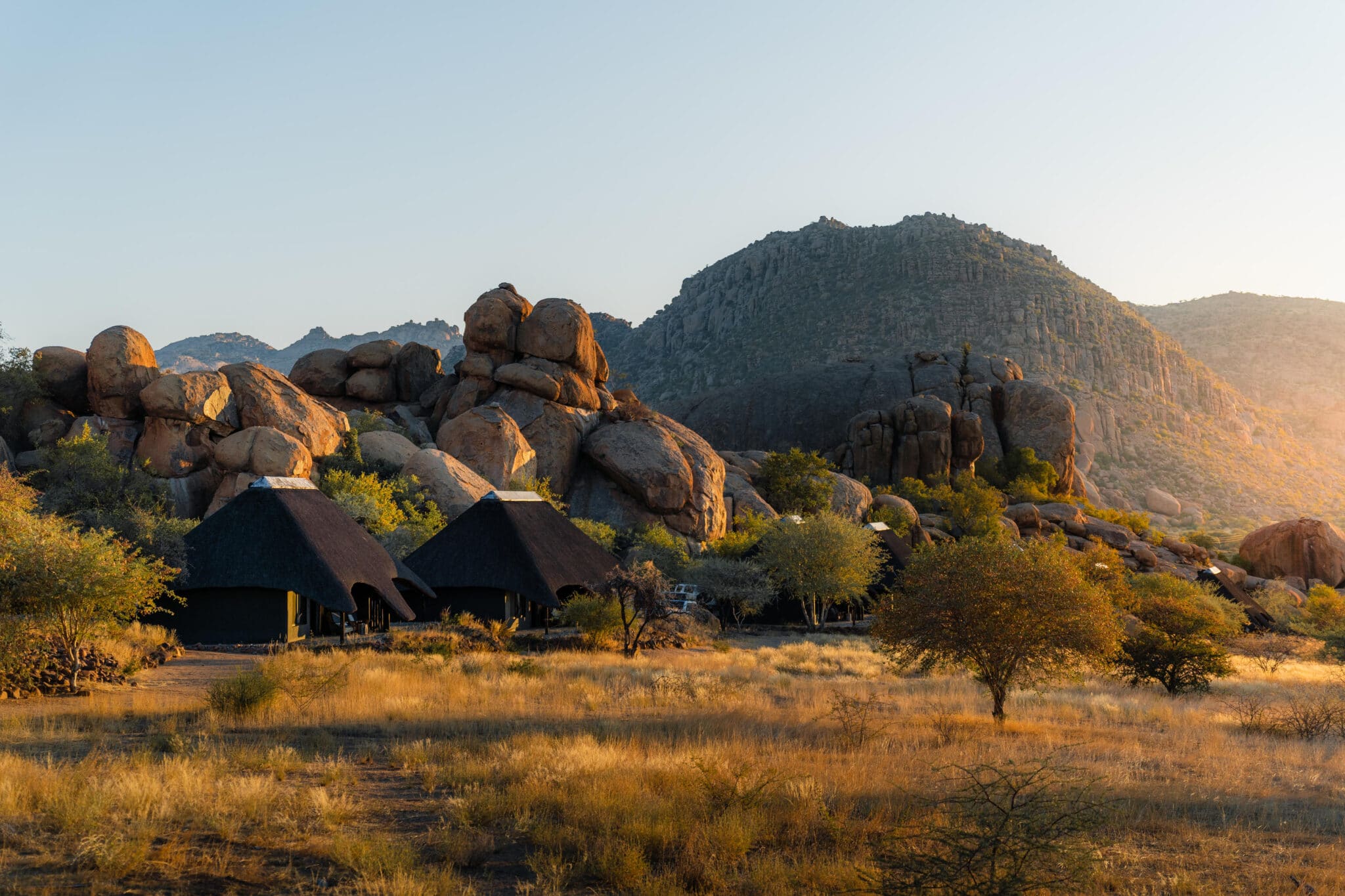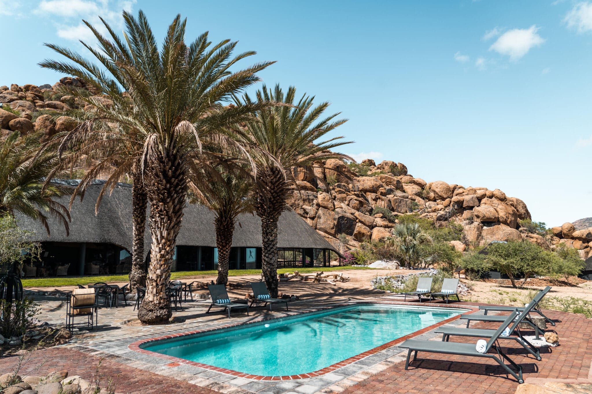 Ai-Aiba -The Rock Painting Lodge, set against imposing granite boulders in the foothills of the Erongo Mountain range, is a sure to wow in every facet.The lodge, with its high thatched roof restaurant, lounge and pool is an oasis surrounded by tall palms and scenic vistas of magnificent rocky outcrops and bush savannah. Towering boulders form the backdrop to the mountain facing chalets with views that incorporate this rugged landscape.There are 20 rooms on site, a combination of Twin, Triple and Quadruple rooms, each with a private patio, en-suite shower and air conditioning to ensure a comfortable stay.With a pool, bar and restaurant, the lodge has everything you need to help unwind and relax in between the feast of activities on offer, which include bird watching, game viewing, guided walks and natural history tours and cycling.