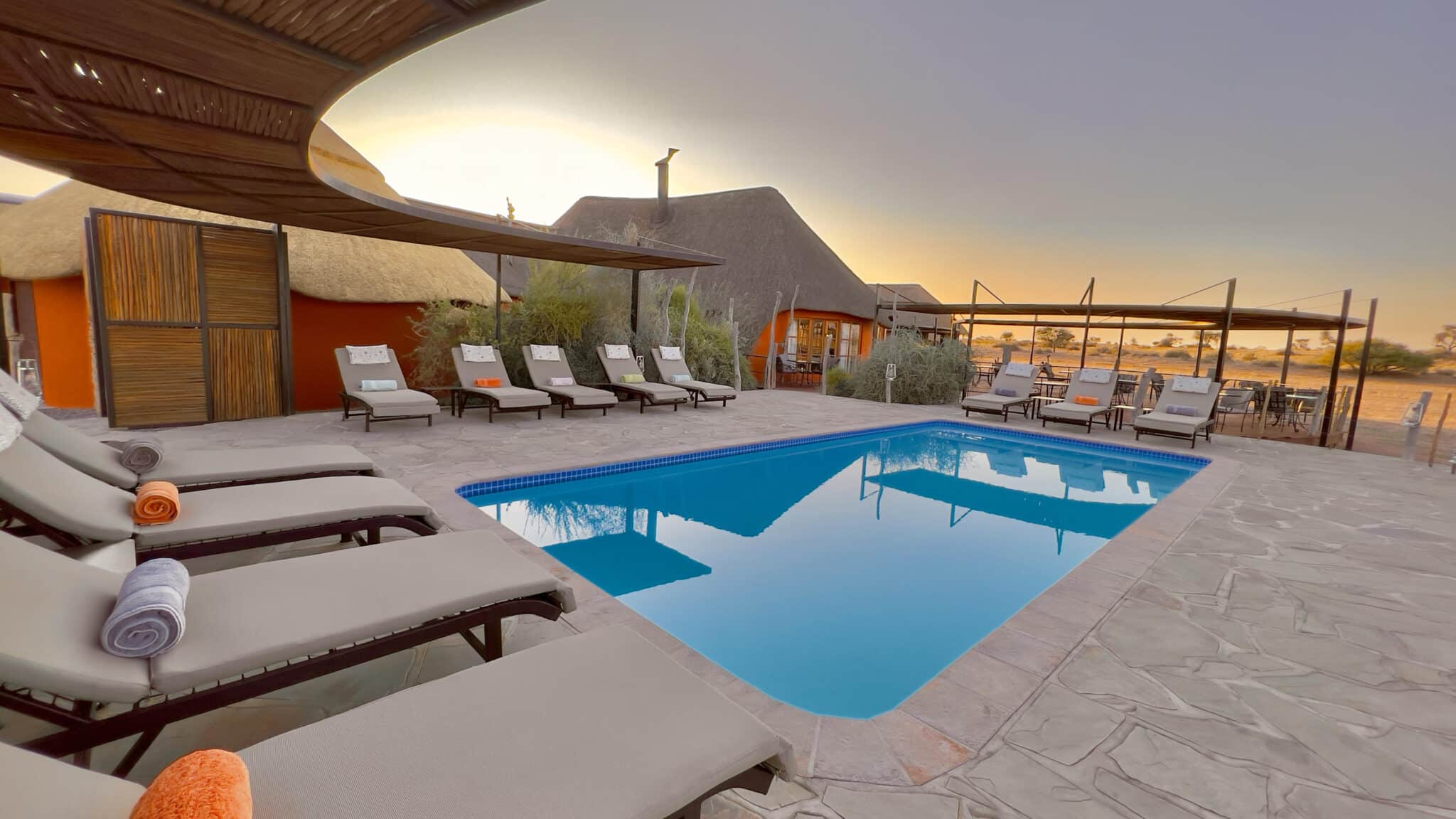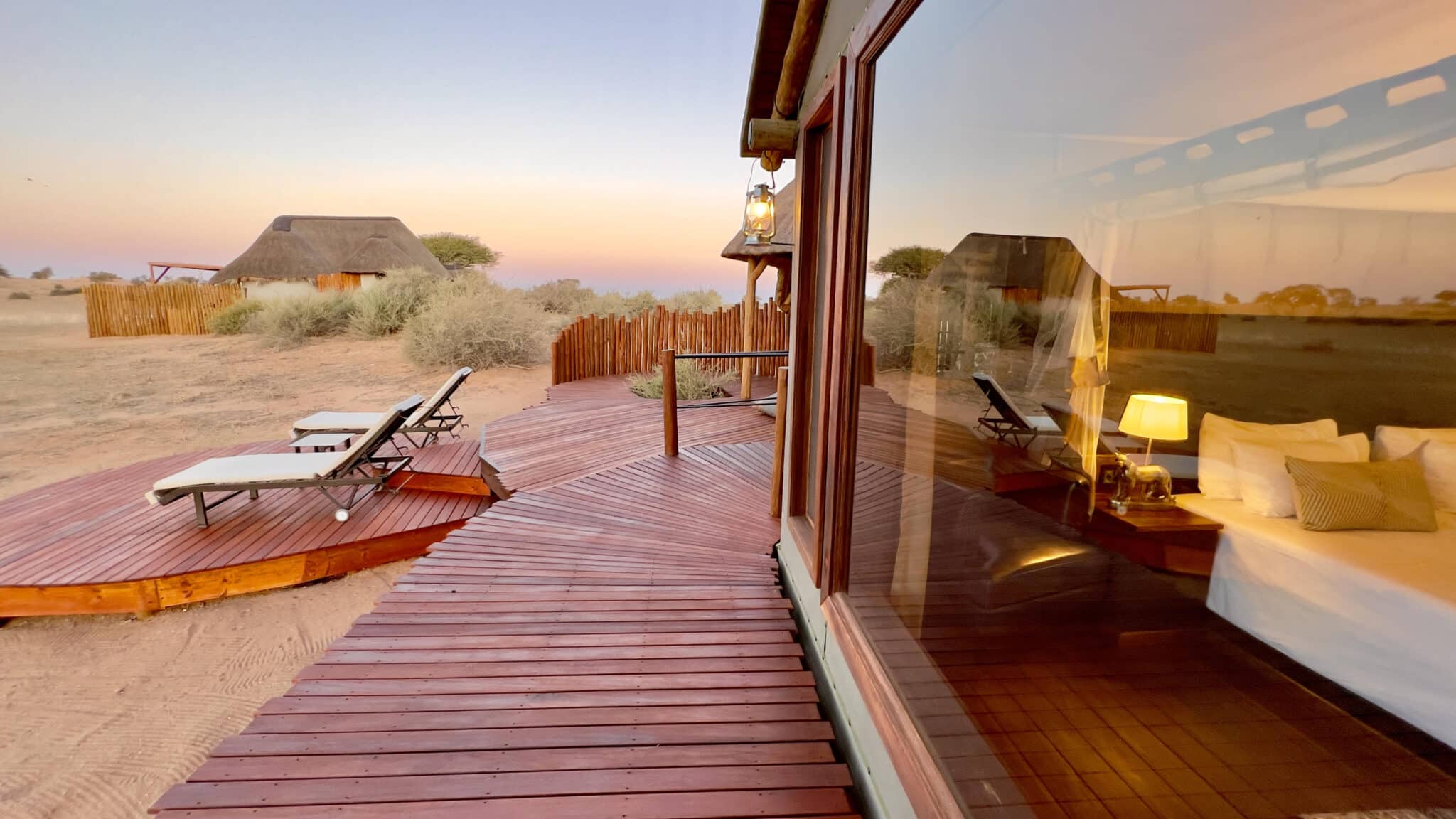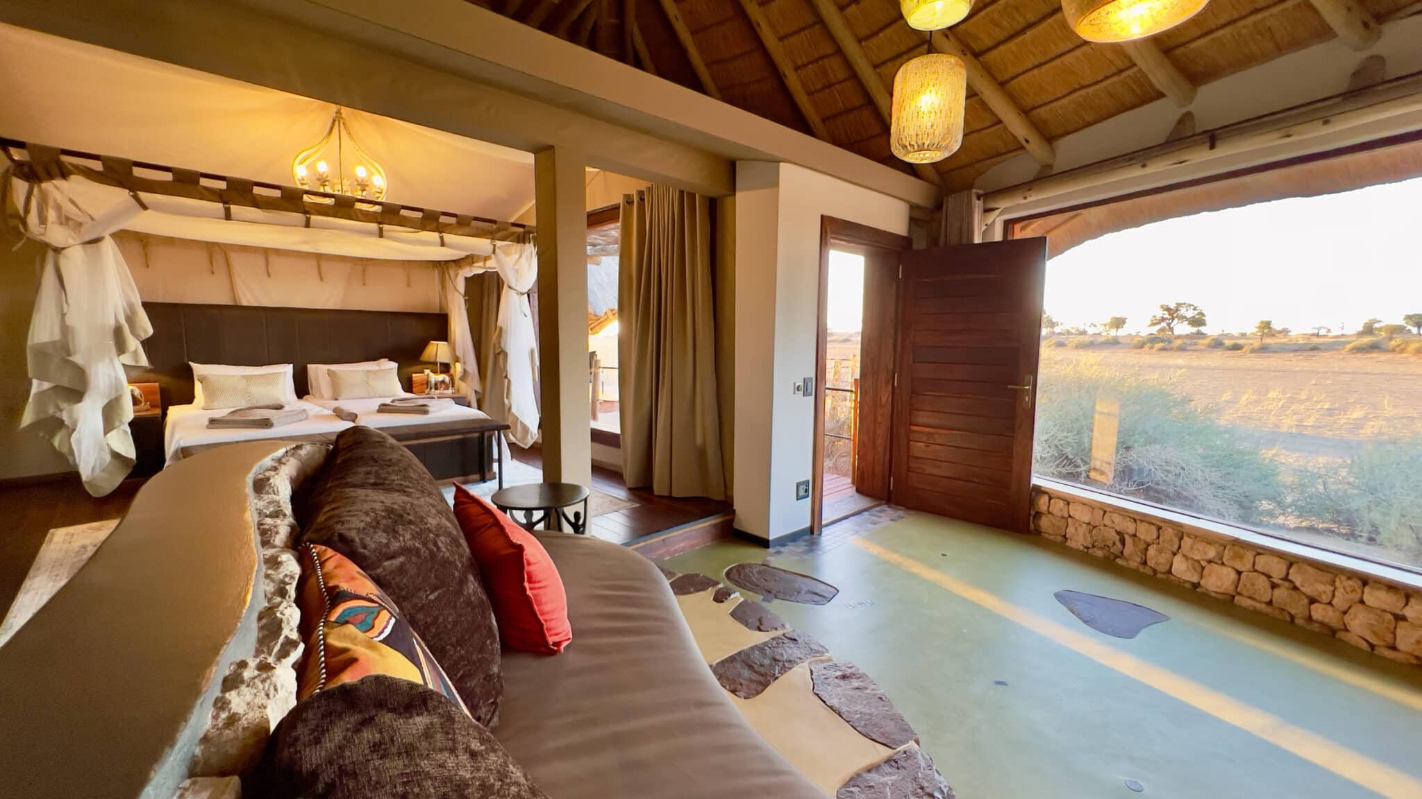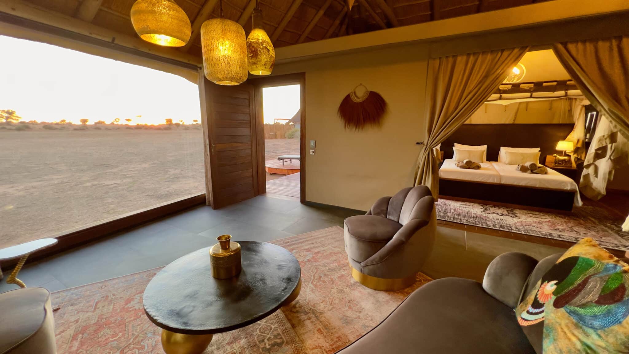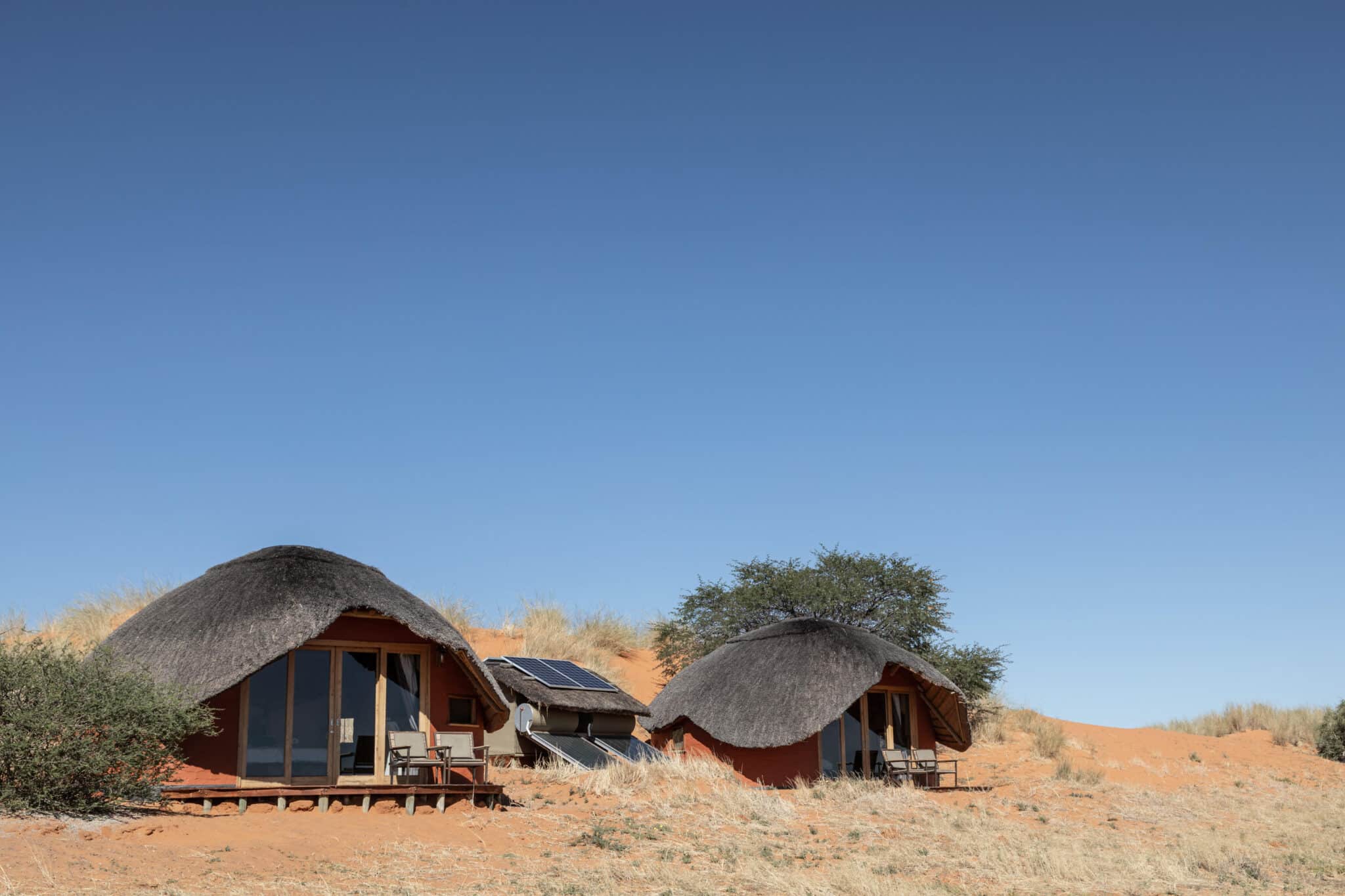 Kalahari Red Dunes Lodge offers a spacious and private retreat. The main house, housing the reception, lobby area, restaurant and bar, along with a swimming pool and sun deck, is situated in a dry lake known as a “Vlei. ” A wooden boardwalk connects the main house to the suites, which are scattered around the “Vlei,” providing an excellent vantage point to spot various wild animals. Each guest house features canvas walls, a stone-walled area with a thatched roof, and a private terrace furnished with cosy sofas. Guests can embark on hikes and game drives to witness the breathtaking beauty of the Kalahari Desert, with its striking red dunes reaching heights of up to 30 meters, and a diverse array of wildlife.