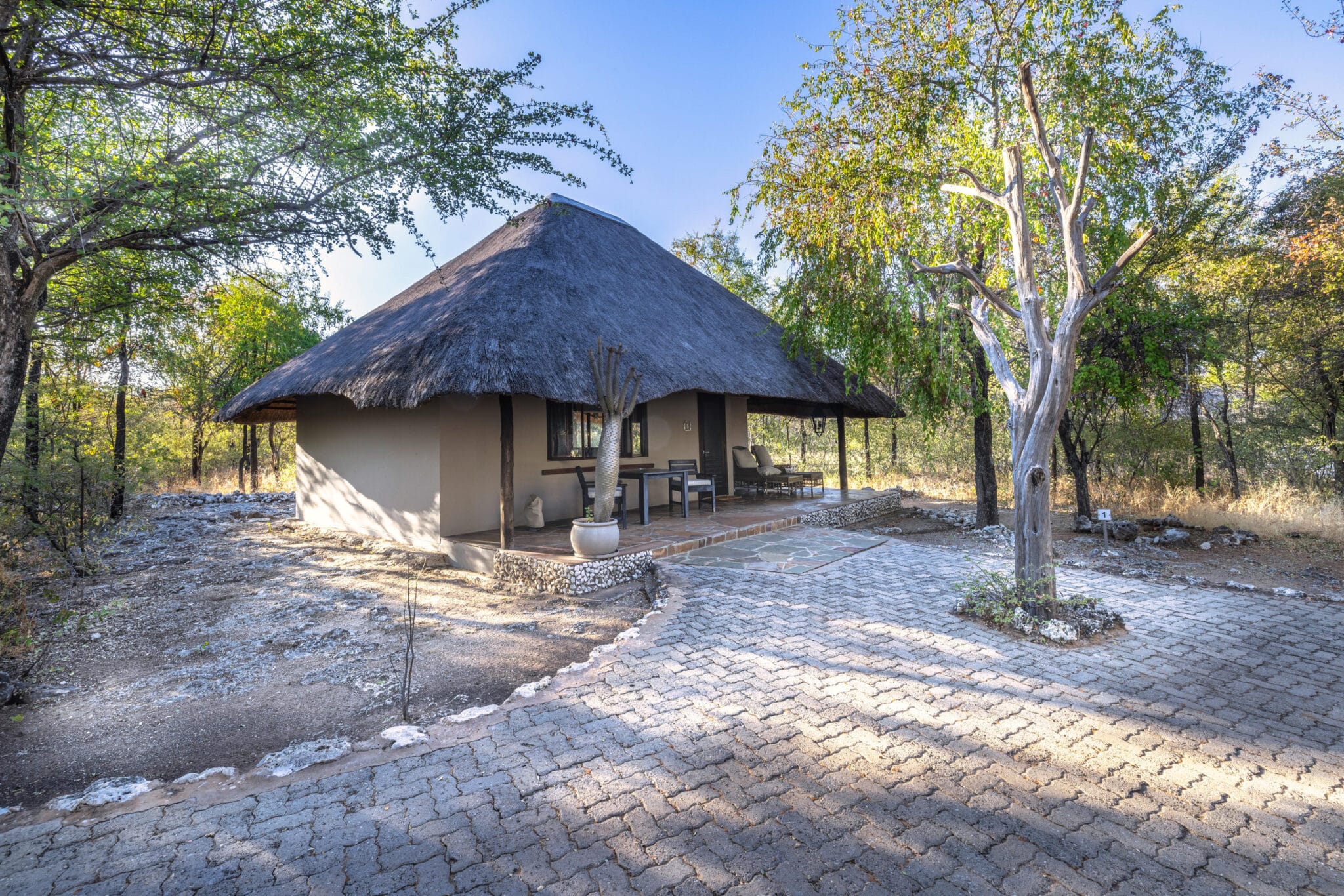 Situated a mere 8 km from the Von Lindequist Gate on the eastern boundary of Etosha National Park, Mushara Lodge offers an excellent overnight stay option for visitors to the renowned game reserve. The lodge comprises ten spacious chalets, a family unit, a triple room, and two single rooms, providing comfortable and ample accommodation. The name “Mushara” is inspired by the abundance of the purple pod Terminalia tree, which graces the lodge grounds and the surrounding area. The thatched public area features a cozy library with an array of engaging books, a well-stocked bar boasting an extensive wine cellar, a bright and inviting lounge complete with a fireplace for winter evenings, a dining area, and a curio shop filled with a delightful selection of souvenirs. The lodge’s interior design showcases meticulous attention to detail, with an eclectic fusion of traditional African elements and contemporary art pieces, interspersed with vintage paintings that add character to the ambiance. At Mushara Lodge, guests are treated to a harmonious blend of modern comforts and African charm, ensuring a truly memorable and enriching experience.