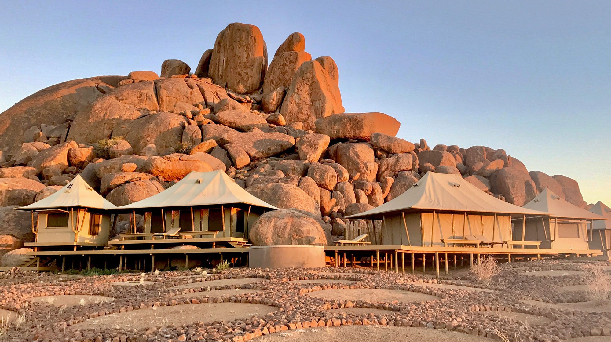Situated 45 kilometers south of Wolwedans and hugged by massive granite rocks, Boulders Safari Camp is the latest addition to the Wolwedans Collection. Sleeping a maximum of eight guests in four spacious tents, Boulders is undoubtedly the most exclusive camp at Wolwedans. Boulders is surrounded by massive granite rocks, sleeping a maximum of eight guests in four spacious tents. The main area consists of a dining and lounge tent, a breakfast deck and open fireplace. Sundowners can be enjoyed from the top of a mountainous rock plateau close by, delivering epic impressions of the vast beauty of the surroundings. From Boulders Camp you will explore the deep south offNamibia’s NamibRand Nature Reserve. Guided scenic drives, or two to three hour walking safaris treading along the ancient hunting grounds of the bushmen, will happily fill your days.Boulders provides a classic safari experience and the camp calls for a two night stay – ideally booked in combination with one or two nights at any of the other camps in Namibia’s dunes.All meals at Boulders Camp are a lavish, but unpretentious affair. They exude a sense of occasion with elegant table settings, candlelights and entertaining menu announcements in the local Nama language.