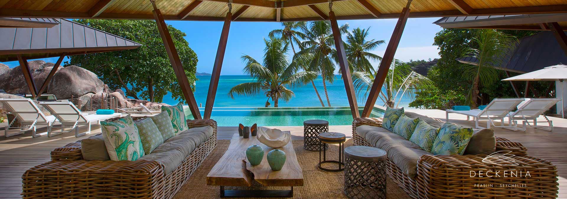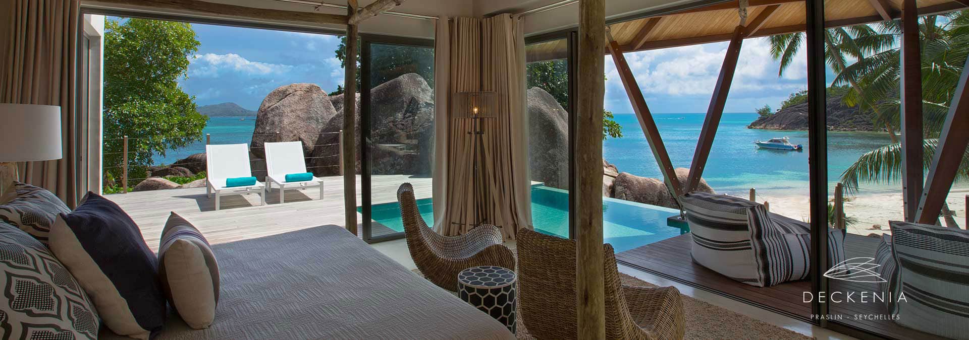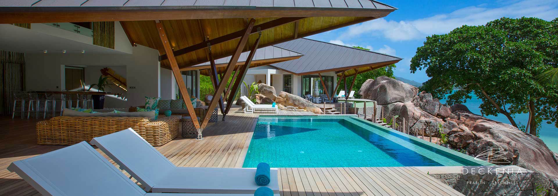 Villa Deckenia is a luxury private villa on the east coast of Praslin Island, close to the fabulous Cote d’Or. Nestled beside Anse Gouvernement beach, among giant Seychelles granite boulders, this sumptuous property of 5300 square metres offers an oasis of peace and serenity. The Deckenia property consists of five bedrooms. The main house has 3 bedrooms as well as a lovely swimming pooll overlooking the beach and ocean; two slightly separate rooms (linked to the main house) each have their own private infinity pool. The villa is ideal for accommodating large families or groups of friends up to 10 adults and 2 children as it is for exclusive use.
