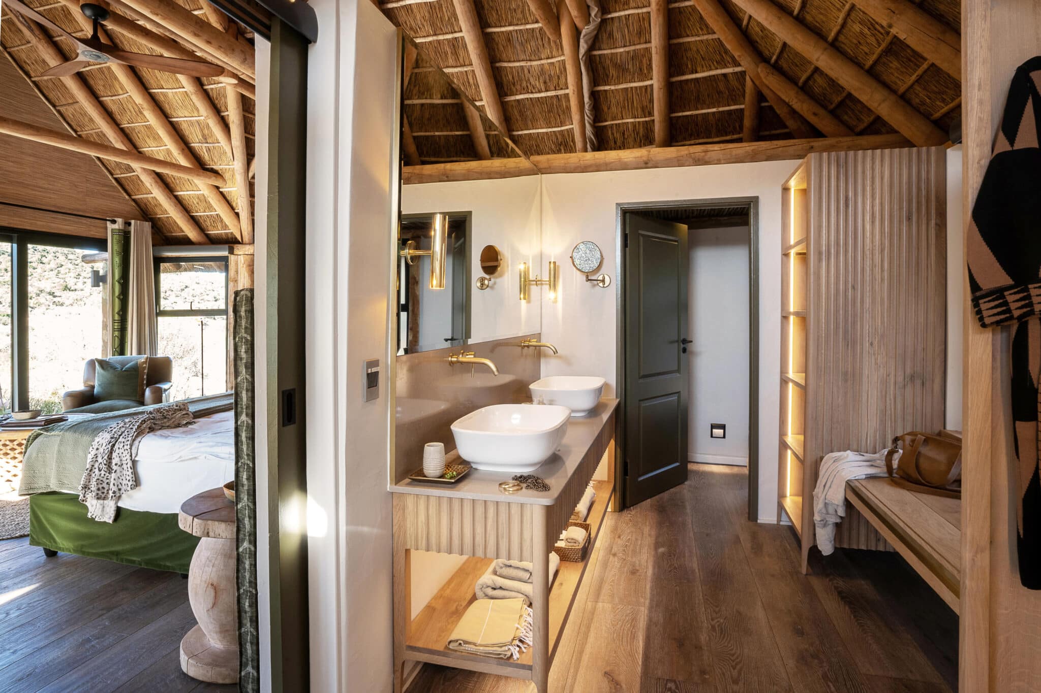 Featuring a classic-contemporary style of understated elegance and earthy tones, Great Fish River Lodge is all about tranquility and solitude. Watch majestic kudu meander down to the river from the Lodge’s expansive viewing decks, or soak in the views from the privacy of your suite’s own plunge pool. The nine luxurious suites have been designed to take full advantage of the spectacular scenery. Floor-to-ceiling framed glass doors fold back to reveal an uninterrupted wilderness, and the en-suite bathrooms, complete with bath and indoor and outdoor showers, separate w. c and twin basins offer unmatched views over the sweeping landscape beyond. Keep cool with overhead fans and air conditioning, and enjoy aaspacious thatched veranda and private plunge pool with terrace in every suite.Delicious African-inspired meals are served on private decks, in the candlelit dining room, or in the cosy boma under a magnificent starlit sky. Rugged natural materials like rock, stone and thatch combine with soft-light lanterns, deep overstuffed sofas featuring clean contemporary lines and natural linens with plenty of texture to provide a simple but sophisticated atmosphere, inviting guests to linger and chat in friendly tranquil spaces.