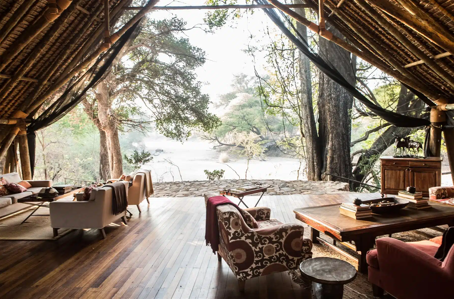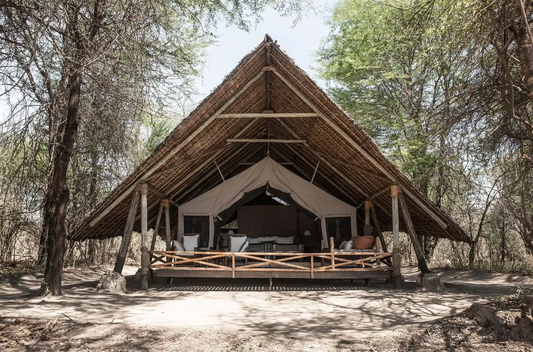 Under the magnificent shade trees, on the banks of a seasonal river in the remote southern sector of the Ruaha National Park, Jongomero Camp is gloriously isolated. Far from the maddening crowds, this secluded idyll offers a chance to discover true unadulterated wilderness. For guests seeking an authentic African adventure, a visit to Ruaha National Park is essential. Remembered for the rapids of the Great Ruaha River and its rugged landscape of great hills, rocky outcrops, and a horizon studded with the imposing silhouettes of the iconic baobab; no other park in Tanzania epitomises the definition of “wild Africa” quite like Ruaha.Blending in beautifully with its surroundings, the camp is tucked below a dappled riverine canopy on the banks of the Jongomero sand river, a natural pathway for animals in search of water. Positioned on one of the meanders with sweeping views of the bank beyond lies the camp bar, lounge and restaurant; an open wooden terrace shaded by a high thatcheddroof and filled with sumptuous sofas and striking furniture made of reclaimed dhow wood. It is an inviting spot to relax with a cup of tea while leafing through one of the camp libraries reference books or socialise with camp managers and fellow guests around the bar with an ice cold drink in hand. Alternatively, on warm days, laze around the pool and enjoy the sights and sounds of being so close to nature. Accommodation at Jongomero comprises of eight large and well-appointed tented suites, built on raised wooden platforms, under enormous thatched roofs that also encompass a spacious private veranda which overlooks the riverbed. Snuggle under warming quilts in an eight-foot wide dhow wood emperor bed and fall asleep to the hum of the African bush beyond your canvas. Wake up to your morning tea tray and animals ambling past your mosquito net windows. The quintessence of luxury in the wilds.