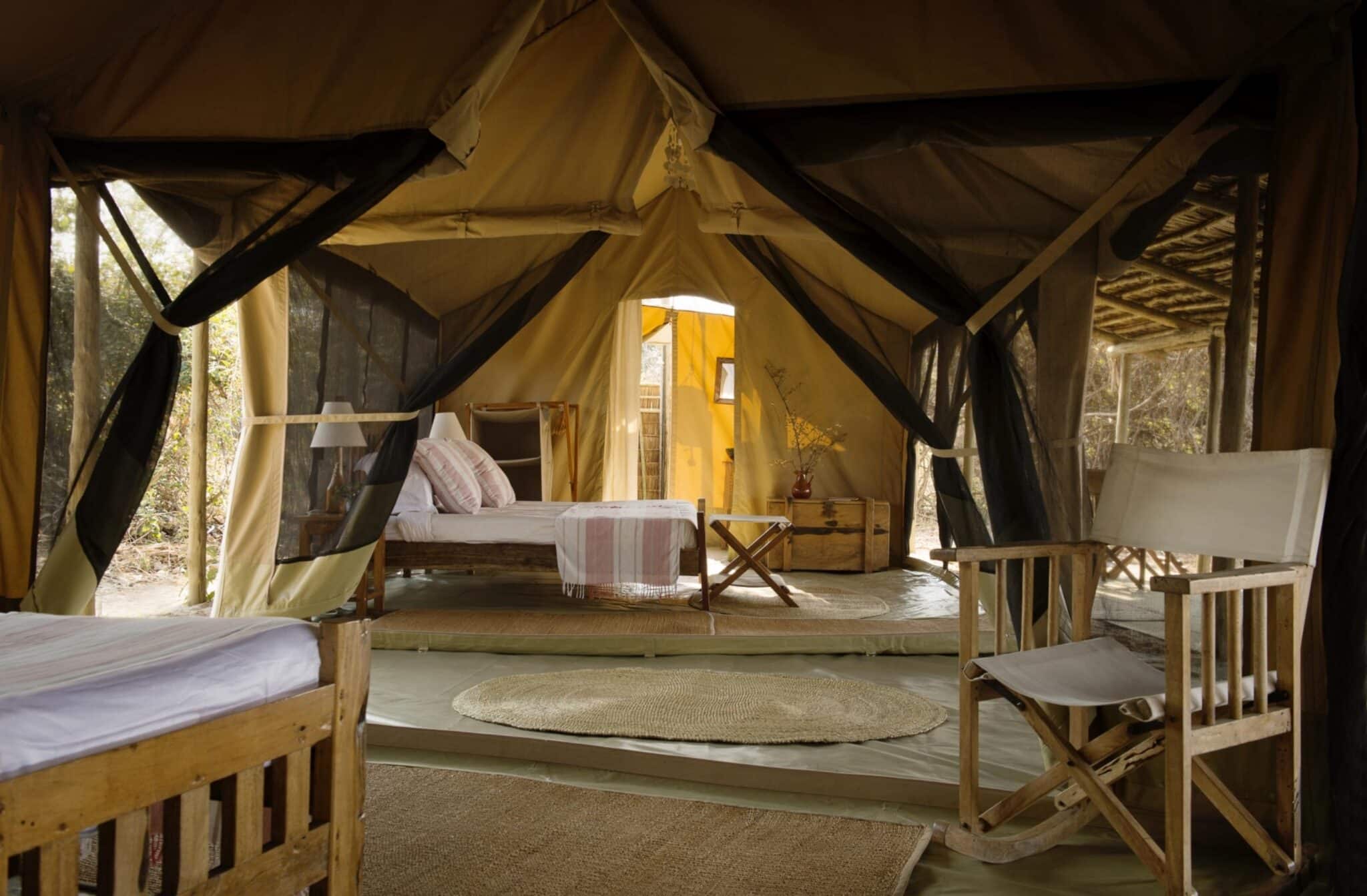 Decorated in classic Safari style with large beds and opulent rugs, the six lavish Meru style tents are deeply romantic.