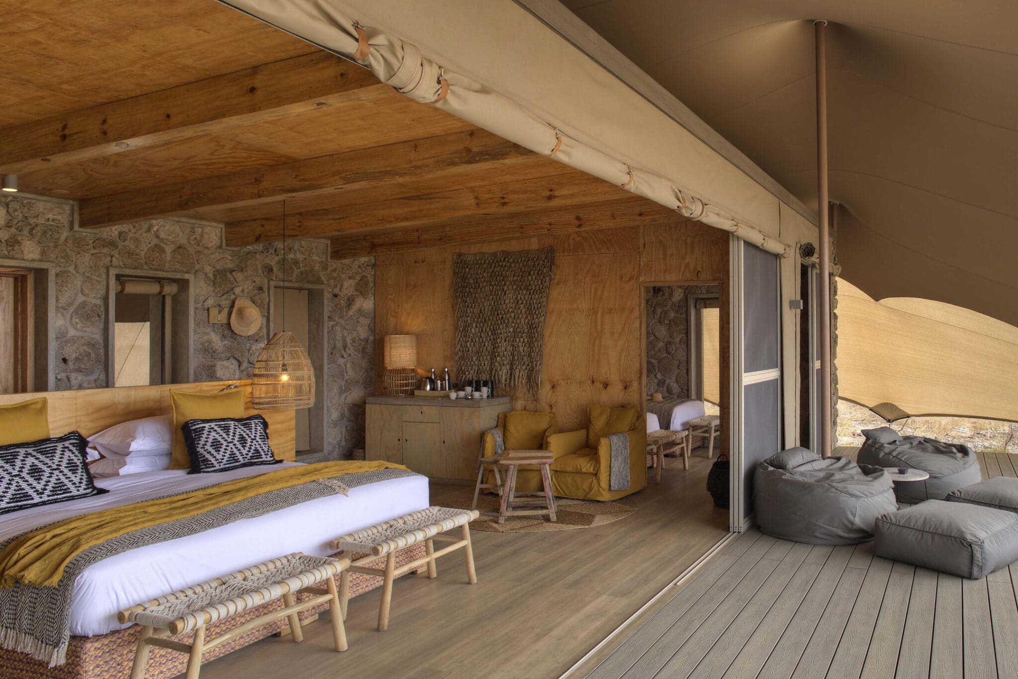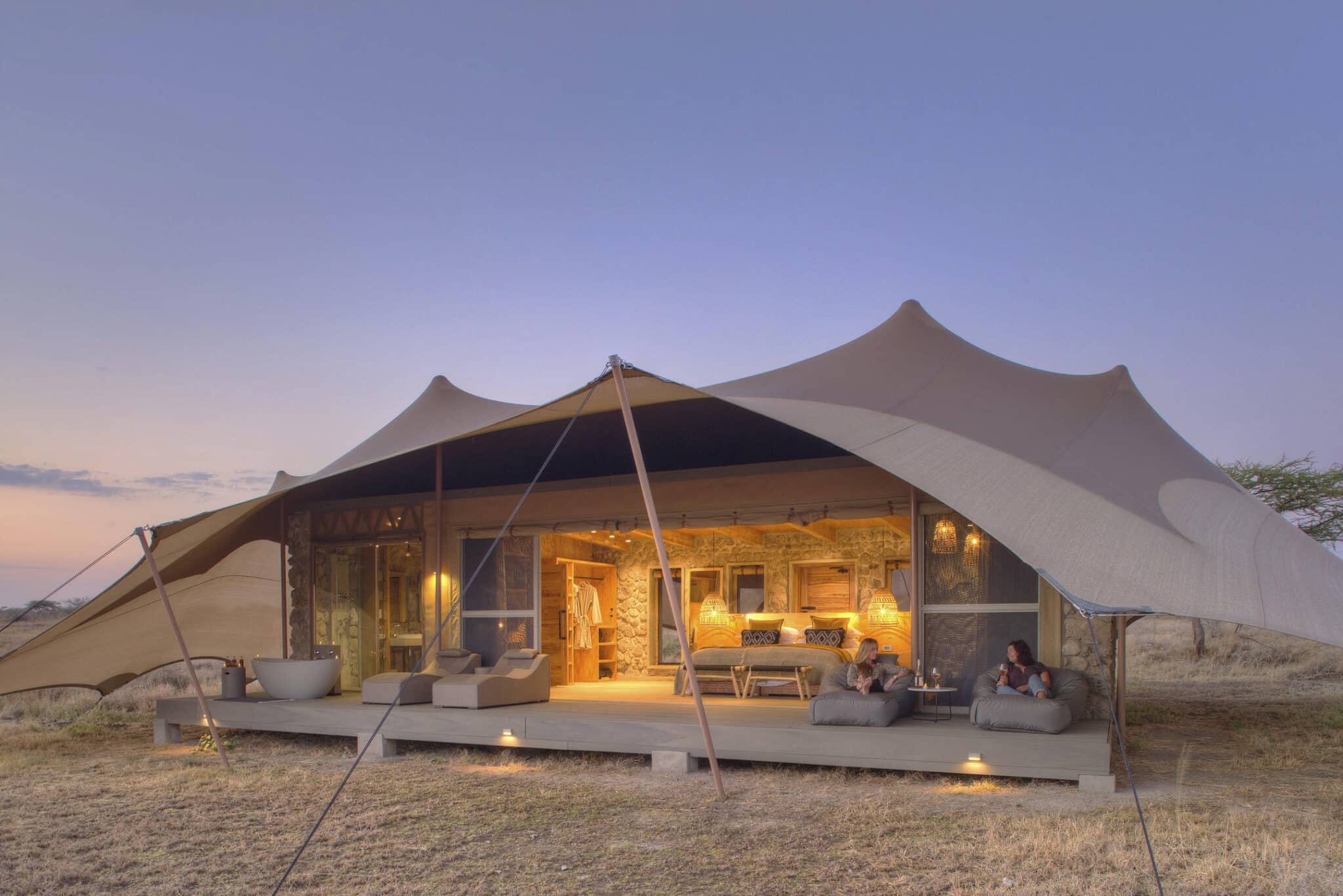 Decorated in classic Safari style with large beds and opulent rugs, the six lavish Meru style tents are deeply romantic.