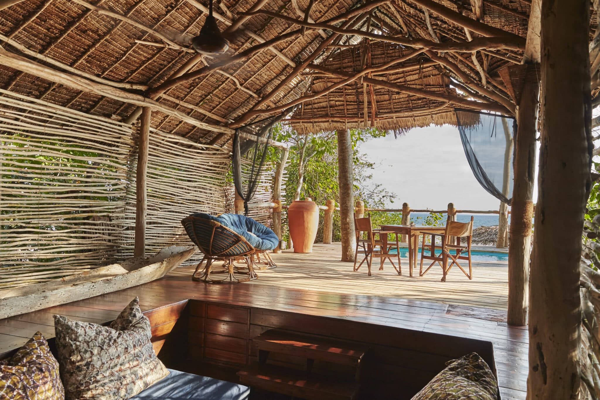 Zawadi sits on a cliff, with a specatucular view of the Indian Ocean, framed by swaying coconut palms and bougainvillea.