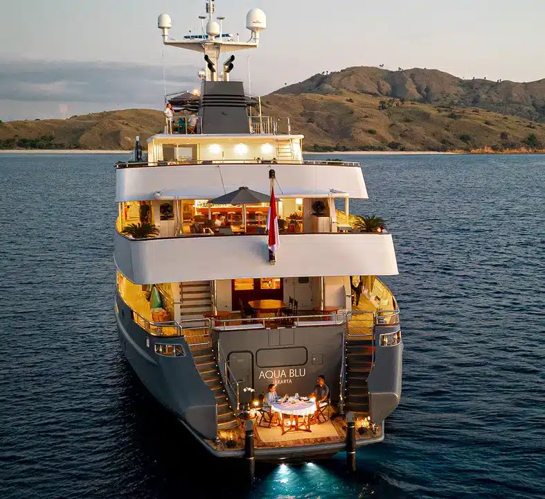 Set sail around the islands of Raja Ampat, Komodo National Park, Ambon or the Spice Islands aboard a former British Naval Explorer, now an upscale expedition-class yacht. Taking you further afield without losing any of the comforts of a luxury hotel, Aqua Blu is a five-deck, 15-suite cruise ship, perfectly designed to navigate East Indonesia’s islands. Quantum Zero Speed stabilisers maintain a high level of comfort, whatever the conditions, meaning you can take a dip in the jacuzzi, practise your sun salutations, or enjoy a massage in the spa in peace.The 15 individually-designed sea-facing suites are spread across four decks and include three cabin types. Each is elegantly sophisticated, with ensuite bathrooms and walk-in showers, a refined palette of neutrals, brass fittings, parquet flooring, and vintage maps of the Spice Islands. Large windows allow you to soak in the view from your cabin, but the real pleasure comes from experiencing the ocean and the islands up close, whether snorkelling through the tropical reef, encountering ancient island cultures, or paddle boarding across a glass-like sea.