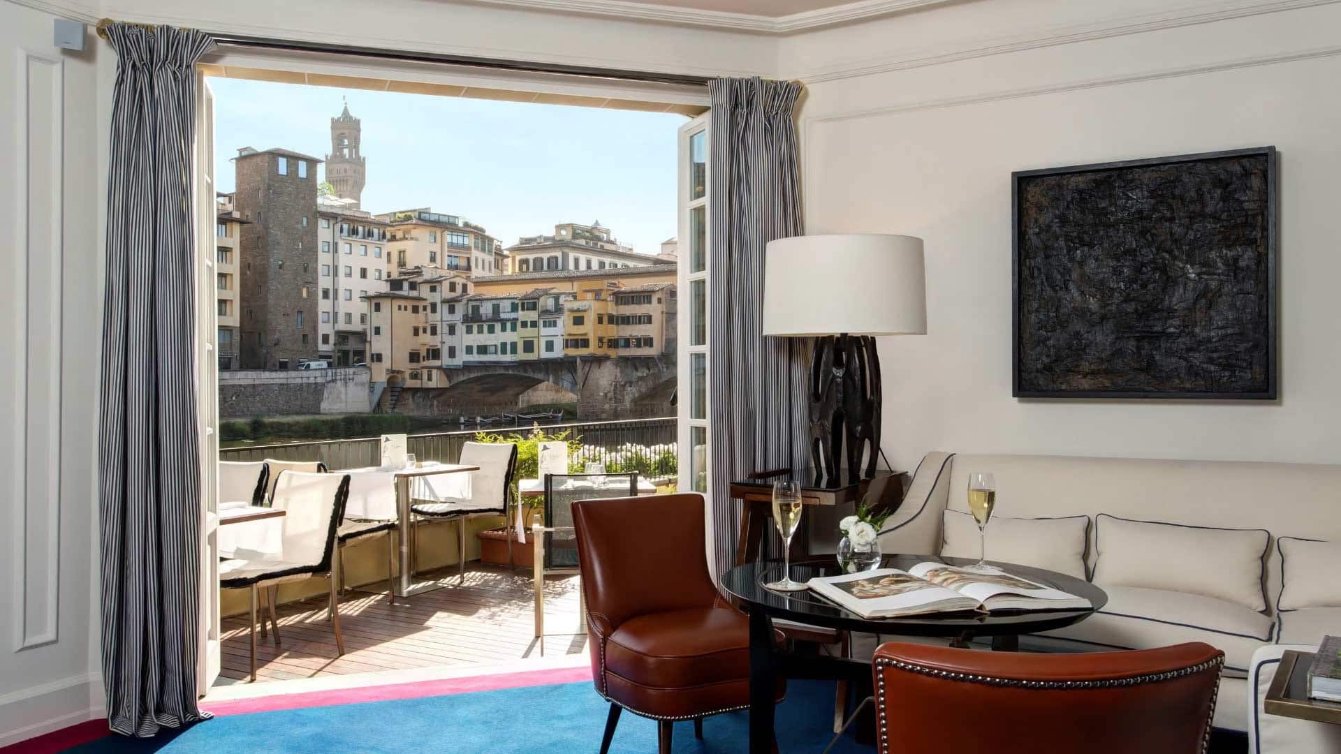 Located on the south bank of the Arno near the iconic Ponte Vecchio, Hotel Lungarno boasts unparalleled river views and is walking distance to Florence’s top attractions. With a chic blend of neo-classical and nautical design, the hotel exudes a considered elegance while a curated art collection of over 400 pieces gives the feel of a private residence of an esteemed art collector. Of the 63 rooms, 40 offer stunning river views which are echoed in the stylishly nautical blue-and-white decor while Nespresso machines and Bose speakers add modern comforts.The Michelin-starred gourmet restaurant, Ristorante Borgo San Jacopo serves exquisite southern Italian cuisine overlooking the Ponte Vecchio, while the Picteau Bistrot offers a more relaxed dining experience with the same jaw-dropping views. For a change of scene, explore the cafes and restaurants of the Oltrarno neighbourhood to refuel after a visit to the Uffizi gallery, Palazzo Vecchio and Pitti Palace which are just five minutes’ walk away.