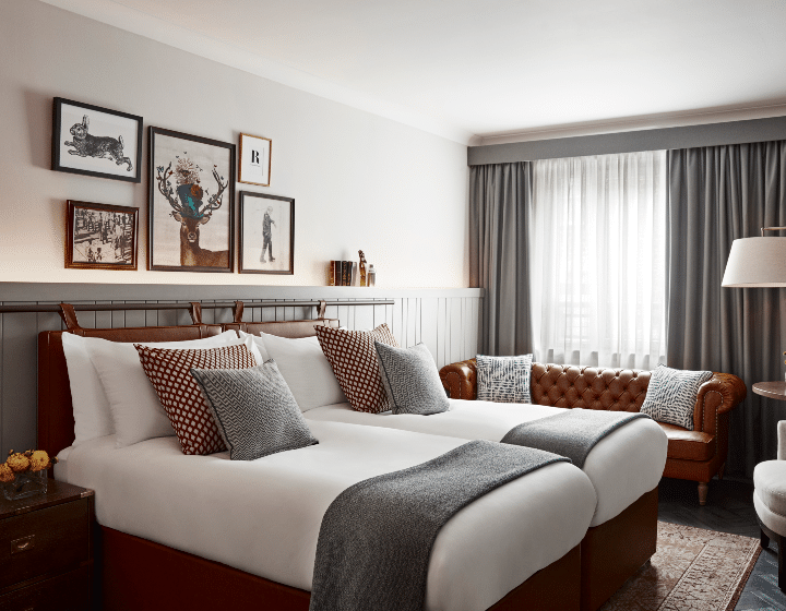 From its prime city centre position overlooking Charlotte Square at the west end of George Street, this stylish hotel combines mid-century glamour with Scottish hospitality in its grand Georgian exterior and eclectic but effortlessly hip interiors create an atmosphere and appeal that’s both chic and inviting. Service and facilities at the hotel are top rate, with bikes available to explore Edinburgh, a fitness room featuring Peloton sessions, and a spa offering indulgent treatments like seaweed body wraps. Dining options include the lively BABA restaurant, serving Middle Eastern mezze-style sharing plates with Scottish influences, and the light and airy Garden Room. Guests can enjoy relaxed fine dining at Aizle where everything is made in-house, from the live ferment in the sourdough to the hand-churned butter, showcasing the magic to be found when the finest seasonal ingredients and skilled culinary craftsmanship meet.The 199 guest rooms, including 18 suites, are a contemporary take on traditional Scottish warmth, such as tartan throws, tweed, and vintage-look telephones. Expect cosy yet stylish rooms, complete with modern amenities like anti-fog mirrors in the bathrooms and record players and roll top baths for added charm in select rooms.