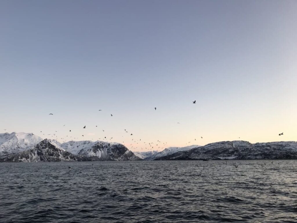 We jetted out onto the high seas back on Svein’s rib worthy of a Norwegian James Bond, complete with beer holders and thermal hood – something I was grateful for as the sun rose and the thermostat did not, sticking smugly at minus five. As we zipped along on our inflatable vessel I felt ludicrously tiny compared to the mountains that shot up all around. We travelled at full throttle down the channel between the island and the mainland. Whilst bombing along Svein told us stories of the fjord; reindeers he had seen swim from one side to the other only to sniff the foliage, immediately lose all appetite and swim home. As he went to launch into another anecdote, something grew from the water and waved – the tail of a humpback whale playing on the surface between deep-sea dining on shoals of herring. For us on the surface, this sighting was only an appetiser.