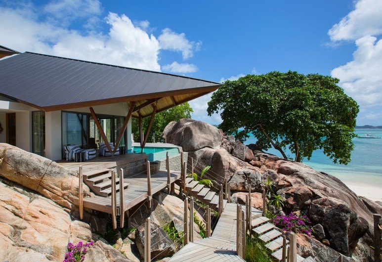 Villa Deckenia is the ultimate paradise escape for a private group, in a secluded setting on the bright white beaches of Praslin Island. The five-bedroom beachfront villa hosts up to 10 adults and 2 children, with 5,300 m² of luxurious living space and large terraces offering pools and views straight out onto the ocean. The main villa boasts three bedrooms, with two additional private bedrooms with an infinity pool each. Huge windows throughout mean tons of natural light and sweeping views out to the ocean, perfect for dining together. Your stay is completely hosted with chef and staff on hand, with a range of non-motorised watersports included keeping the whole group entertained. It’s the ultimate tropical bolthole to escape to together with family and friends.