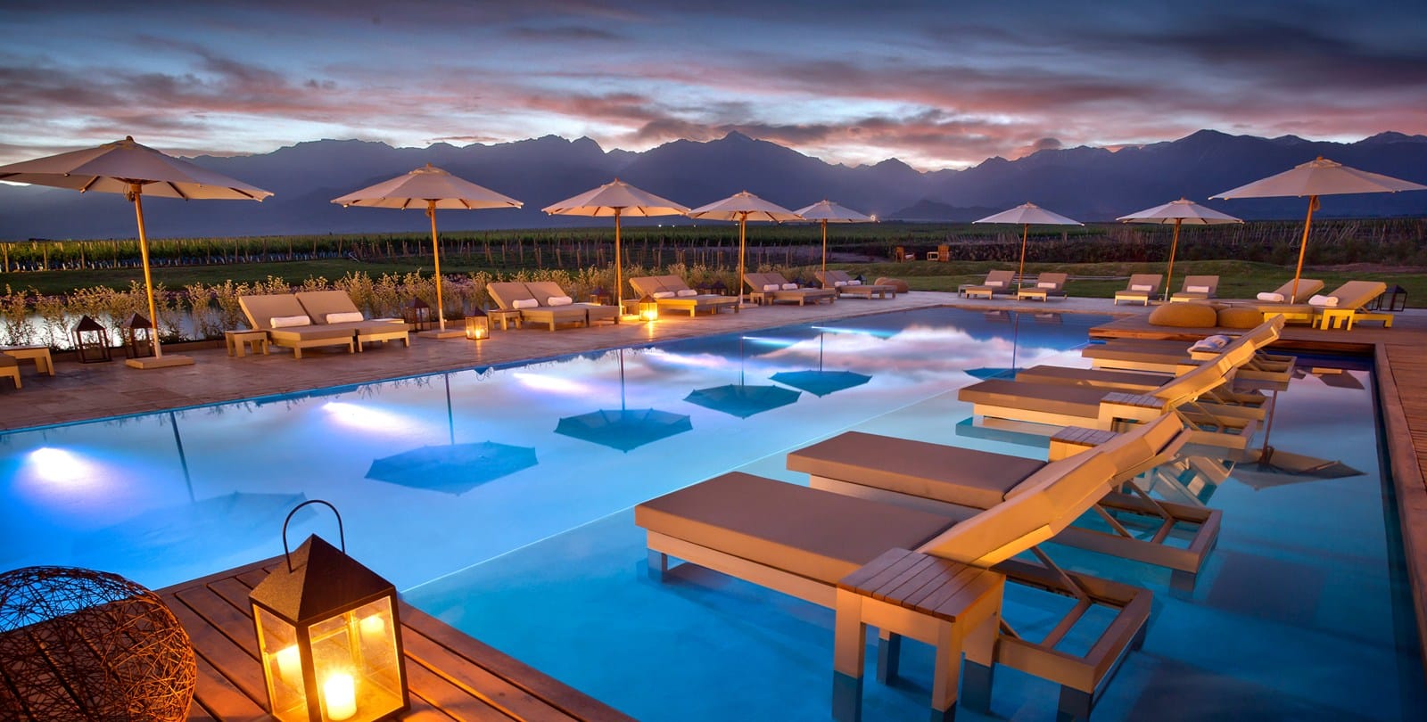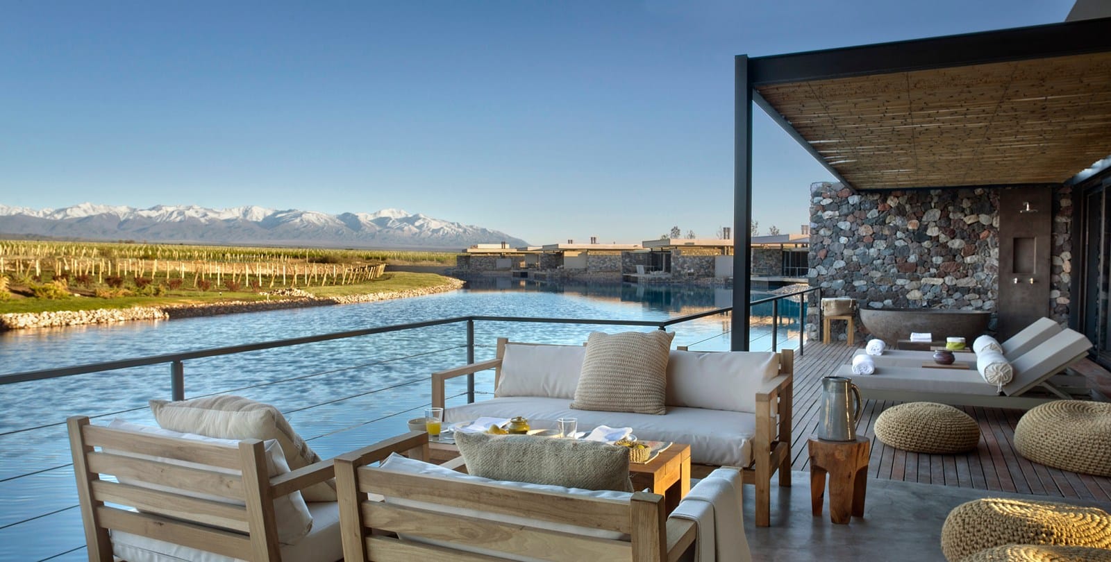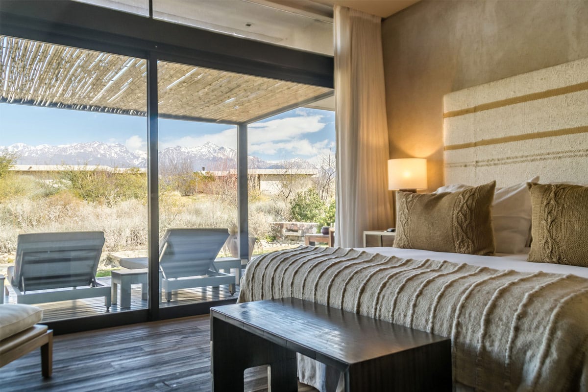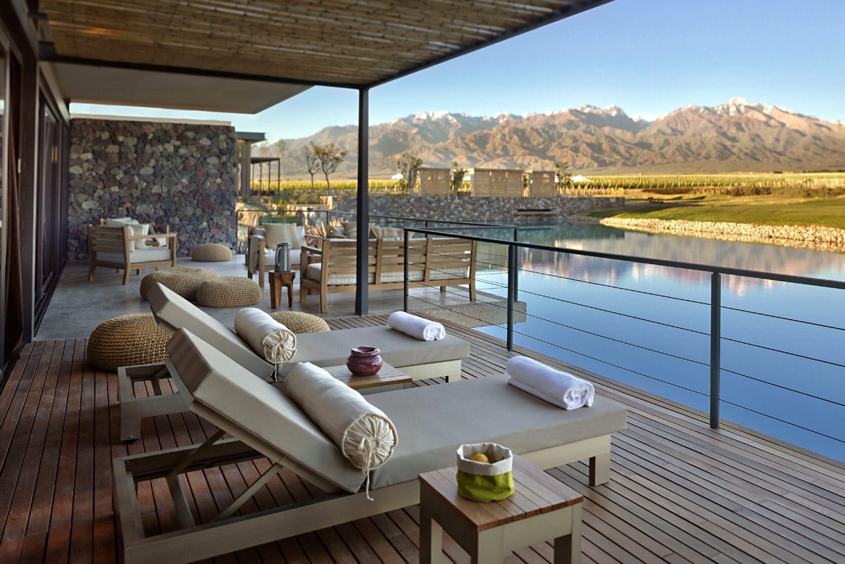 The Vines is a luxurious wine hotel located in the Uco Valley, an hour and a half outside of the city of Mendoza. It’s set on more than 1500 acres of pristine private vineyards and is a wonderful place to relax, drink delicious wine, learn about winemaking (and even make your own batch!) and enjoy excellent food prepared by their chef famed for his open-flame cooking techniques.The Vines has 21 villas of different sizes, some with more than one bedroom which work well for families of friends sharing. It has an onsite restaurant, cosy wine cellar, gym, spa and offers a range of activities, including horse riding and heli-skiing.