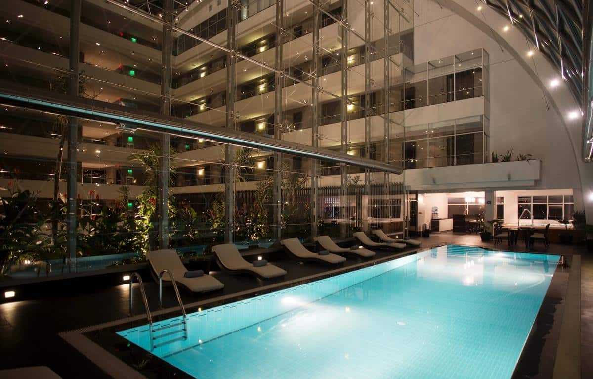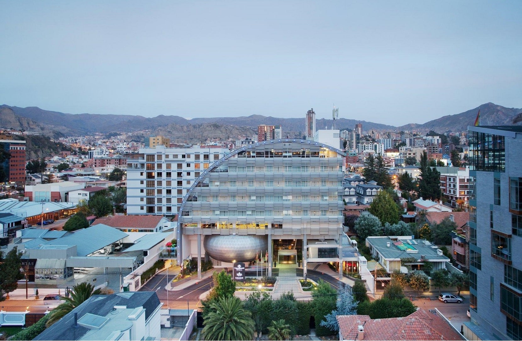 The modern Casa Grande Hotel is located in the heart of the southern residential area of La Paz, with luxurrious and cozy rooms and fabulous views of the city. It boasts innovative architecture with eclectic décor, and has beautiful Indoor gardens surrounded by a central atrium covered by a glass dome. Warm, efficient and personalised service is provided assuring guests a memorable experience.Casa Grande has 65 rooms as well as a health club, swimming pool and a sauna. Suitable for both families and couples, although with a feel of an upmarket business hotel, it has an on-site restaurant with international cuisine as well as a café and shop and a bar/lounge area.